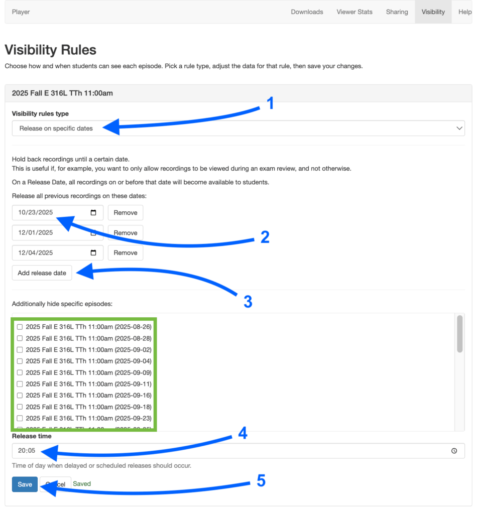 A ‘Visibility Rules’ page will load. Under your course title there is a drop down menu with four options. Information on how to ‘Delay release by days’, ‘Release on specific dates’, and ‘Hide all episodes is noted below. To learn how to hide a specific recording, click here.