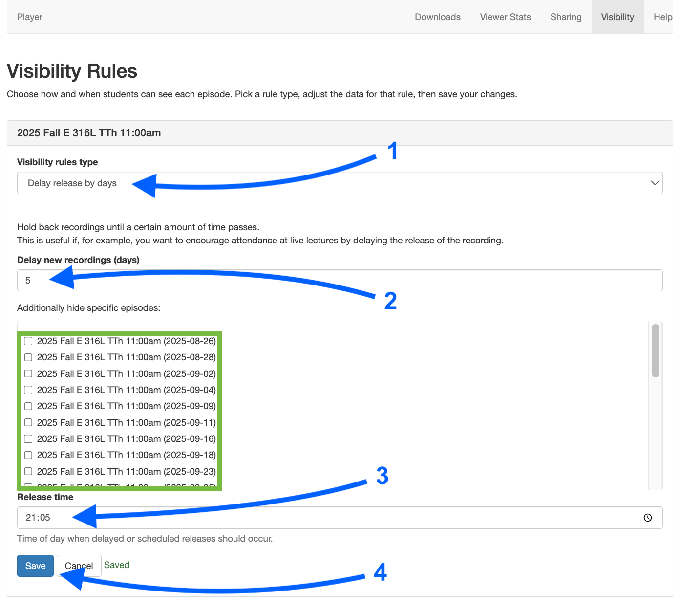 A ‘Visibility Rules’ page will load. Under your course title there is a drop down menu with four options. Information on how to ‘Delay release by days’, ‘Release on specific dates’, and ‘Hide all episodes is noted below. To learn how to hide a specific recording, click here.