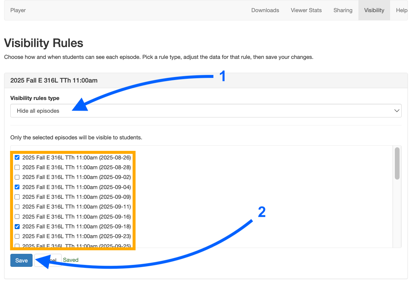 If you want to unhide (make available) a specific recording to all students in your course, you can click the box next to the recording title and then press the ‘Save’ button (noted on the image in the orange rectangle).